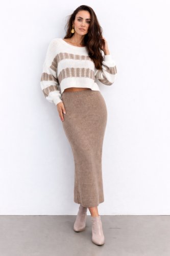 Kadın uzun kollu kayık yakalı salaş triko bluz ve etek ikili takım