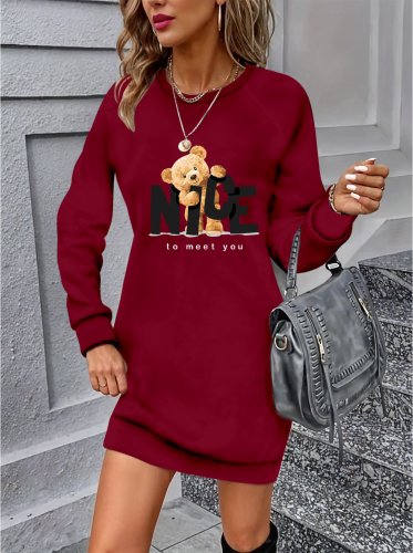 • Kadın uzun kollu bisiklet yaka ayı desenli viskon iki iplik elbise