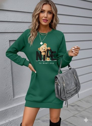 • Kadın uzun kollu bisiklet yaka ayı desenli viskon iki iplik elbise