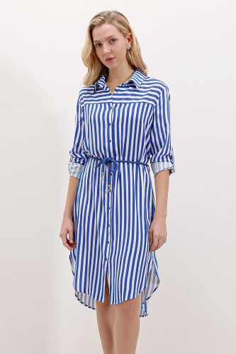Kadın uzun kollu kruvaze yaka beli kemerli yırtmaçlı uzun ithal krep elbise